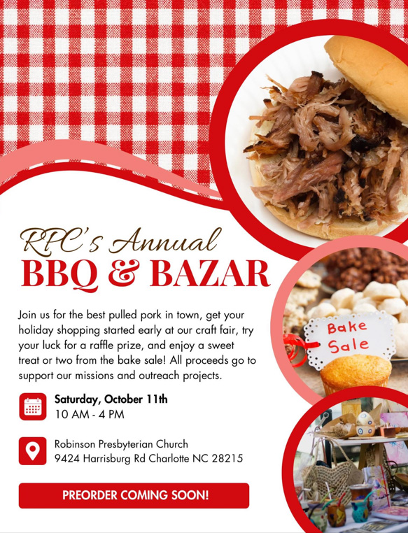Join us for the best pulled pork in town, get your holiday shopping state early at our craft fair, try your luck for a raffle prize, and enjoy a sweet treat or two from the bake sale! All proceeds go to support our missions and outreach projects.